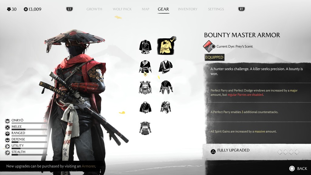 The Bounty Master Armor is much like the Sarugami Armor from Ghost of Tsushima‘s Iki Island DLC (sans the monkey theming), as it empowers perfect parries and disables regular ones. Perfect parry and perfect dodge windows are increased, though. Each perfect parry also yields three counter attacks instead of one. Spirit gains are even increased, which can lead to more special move usage.