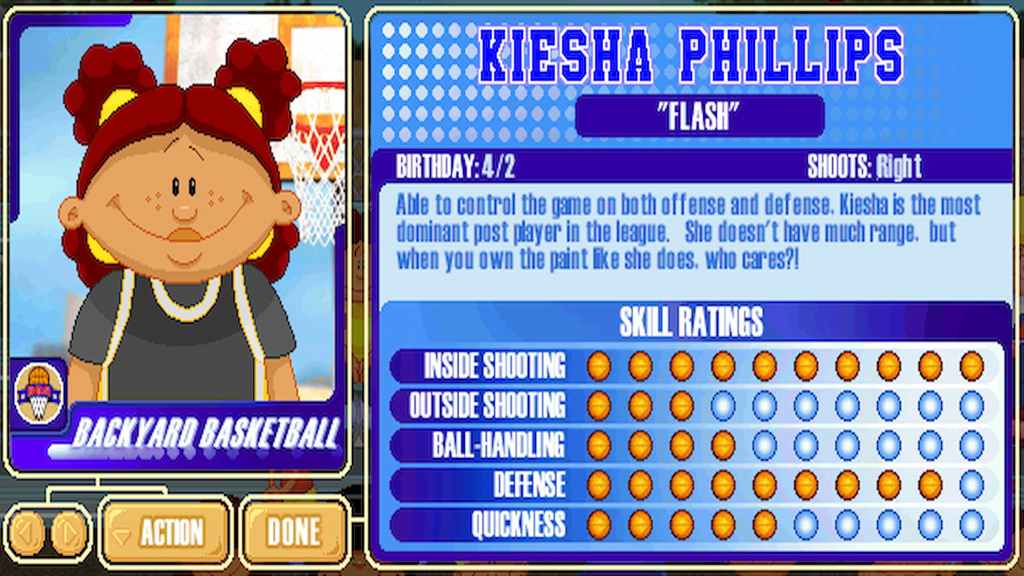 Dante plays quarterback like prime Michael Vick, mixing speed with a massive arm. He’s also one of the best point guards among the Backyard kids and dominates the outfield in Backyard Baseball. He’s not a guy you build your team around, but he’s an excellent second fiddle.