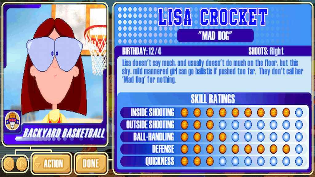 Angela is the best pitcher in the franchise, and it’s not that close. Despite a lack of velocity, her pitches confuse opponents with movement. She’s also a good defensive player in Backyard Soccer and one of the best kickers in Backyard Football. On top of all that, there aren’t many better long-range snipers in Backyard Basketball. Sure, she’s a specialist in most sports, but when you put her in the right spot, she’s outstanding.