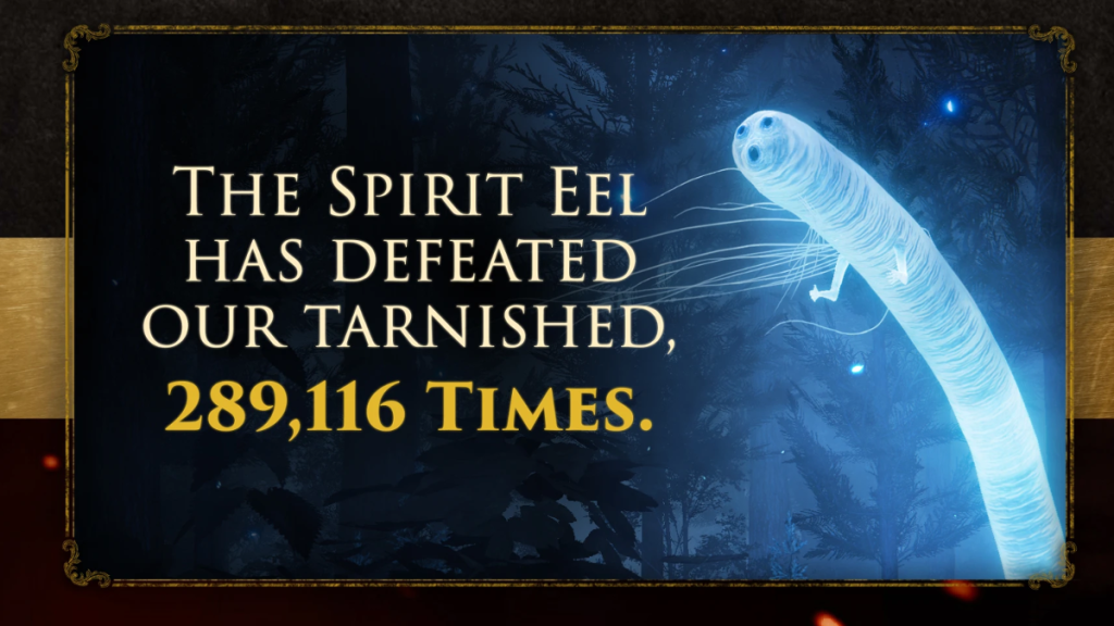 And apparently, close to 300,000 Elden Ring players have picked fights with these Spirit Eels and lost. The official number is 289,116 deaths by the spindly hands of the Spirit Eels, according to Bandai Namco’s graphic shown below, though since that number had to have been cut off at some point for the results to be tallied, we’re probably actually a bit closer to 300,000 at this point.