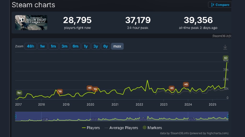 Breaking down the numbers, concurrent player counts increased by almost 200% in the past 30 days, and this new record completely eclipses its previous 2025 high of 14,776 by quite a bit.ย It seems Hollow Knight has been consistently breaking its player count in the years since its 2017 Steam release, which is unusual for a game so long after its release and without many content updates.