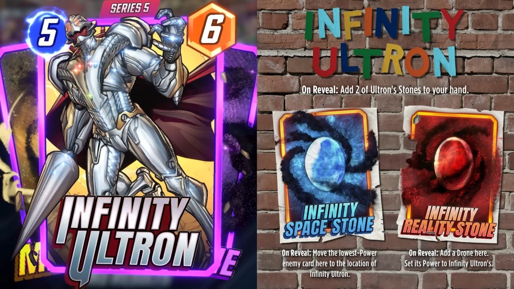 Infinity Ultron is a 5-cost, 6-power card with the ability “On Reveal: Add 2 of Ultron’s Stones to your hand.” Players will get two of the following six stones in their hand: