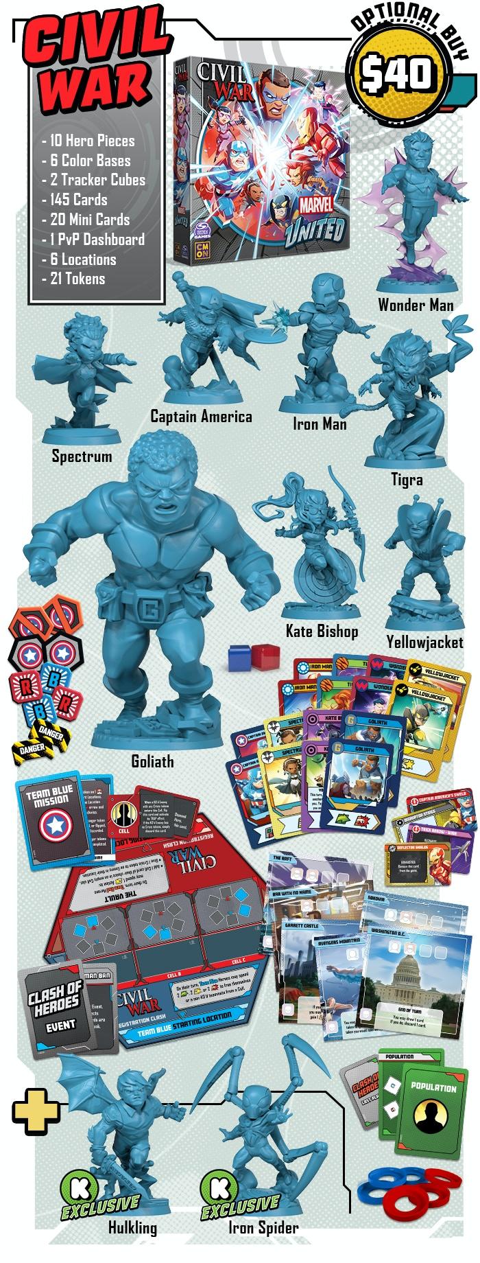 The $40 expansion features 10 hero pieces in total, with the standard heroes being Captain America (Civil War sculpt), Iron Man (Civil War sculpt), Wonder Woman, Spectrum, Tigra, Kate Bishop, Yellow Jacket, and Goliath, and then there are two Kickstarter Exclusive heroes in Hulkling and Iron Spider.