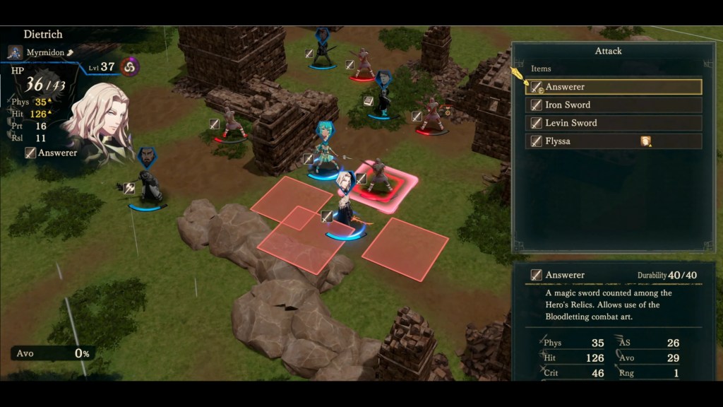 In terms of gameplay mechanics, the new Fire Emblem might incorporate open-world elements, as evidenced by one of the main characters, Cai, running around a large city. From the brief moments that in-game combat is shown, we see that weapon durability is present, along with the usual range, hit, avoid, crit, and attack speed stats. However, there is also a โcurseโ stat on the weapon screen, along with skills, Combat Arts, and Blaze Arts. These menu items in combat are present across the different characters shown in the trailer, so it’s likely they will be mechanics that the new title will focus on. The character Theodora had a โGambitโ option in combat, along with Blaze and Combat Arts, while Dietrichโs brief appearance also showed a Combat Arts option.