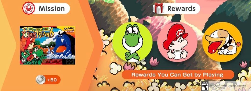 It doesn’t appear that there’s a strict requirement about how much Yoshi’s Island must be played before the free icons are unlocked. Basically, you can just boot up the SNES app, start up Yoshi’s Island, and you should be good to go. Doing so will complete the Nintendo Switch Online mission, which gives the player 50 Platinum Points. Those points can then be spent on buying the new Yoshi’s Island icons, which cost 10 points each. Subscribers can get designs based on Yoshi, Baby Mario, the two of them together, Poochy, and Baby Bowser. Unfortunately, there aren’t any backgrounds based on the game, which seems like a real missed opportunity!ย
