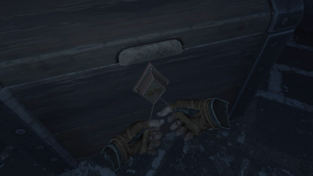The intimacy afforded to Thief through the VR medium isnโt frivolous enough to gloss over, though. Tiptoeing up to an oafish guard and manually nicking his coin purse before slinking back into the void is more engaging because it actually takes a deft touch; a sloppily outstretched hand will result in an alert. Pinching out a candle, literally whistling to distract a nearby goon, chucking objects to manipulate patrol patterns, and sifting through drawers for loot are all actions that are more immersive than simply holding down a button (especially when the occasionally wonky yet mostly effective โImmersiveโ setting that turns on the headset’s microphone is flipped on). Interactions like these take common stealth tropes and benefit from the novelty of having to pantomime them in VR.