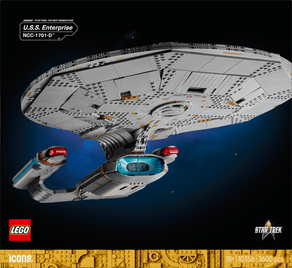 The LEGO Star Trek U.S.S. Enterprise NCC-1701-D ($399.99) is a detailed replica of the starship from TNG that fans can build in 3.600 pieces. Details include a detachable command saucer, secondary hull, warp nacelles, and an opening shuttlebay with two mini shuttlepods. Thereโ€™s also a display stand with an information plaque and a Star Trek: The Next Generation minfigure display tile.