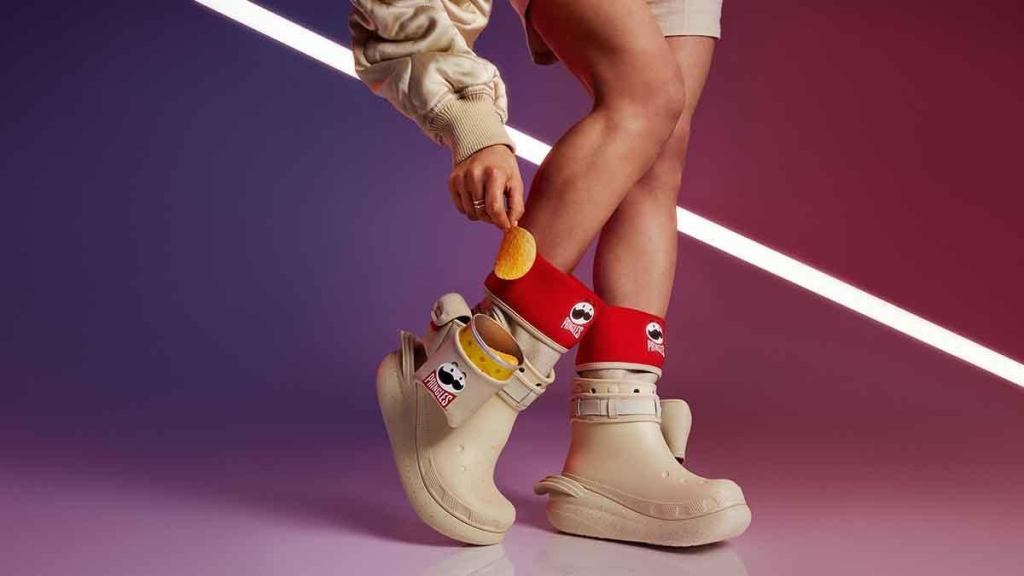 - Pringlesย x Crocs Classic Crush Boot:ย With a playful pop of classicย Pringles-red and a stacked crisp heel, these sleek boots sport a first-of-its-kind custom holster to store a grab-and-goย Pringlesย can so fashionistas and snackers alike can carry their favorite crisps on their favorite shoes. Plus, the first U.S. boot purchasers are in for a flavorful surprise while supplies last as they’ll receive the first-ever Crocs-inspiredย Pringlesย flavor:ย Pringlesย Croc-Tail Party.