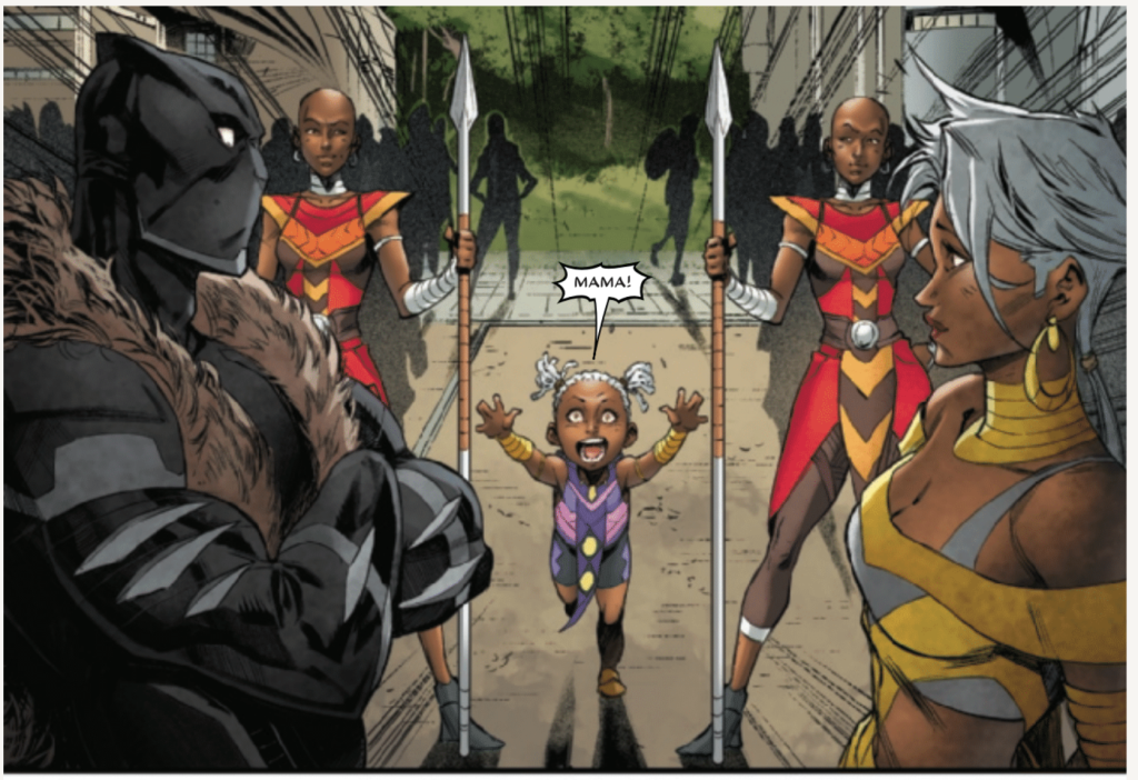 While it’s nice to see the duo in a loving embrace, another surprise is that they have a young daughter named Nkosazana. She’s delighted to see her mama, running up to give Storm a big hug. The family makes quick banter regarding how Nkosazana woke her father up super early, with Storm reminding T’Challa he can’t complain since Storm just got done pushing a helicarrier across the sea from Portugal. When Storm asks where Okoye is, we’re reminded how she was a victim of a mind-controlled Quicksilver in Dark Ages #3.