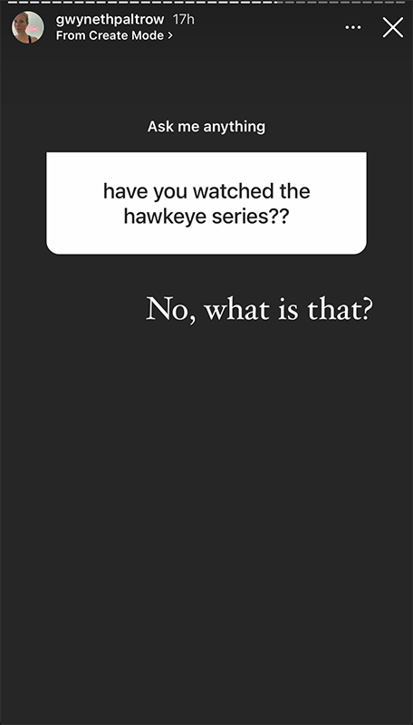 Marvel’s latest series, Hawkeye, is now streaming on Disney+ and while fans are eagerly tuning in each week for the latest episode of the Marvel Cinematic Universe installment, there’s at least one Marvel star who hasn’t seen an episode yet—and didn’t seem to know that the series even exists. On Instagram, Pepper Potts actress Gwyneth Paltrow was answering fan questions on her Instagram Stories. One question left for Paltrow in her “ask me anything” was “Have you watched the Hawkeye series” to which she responded “No, what is that?”