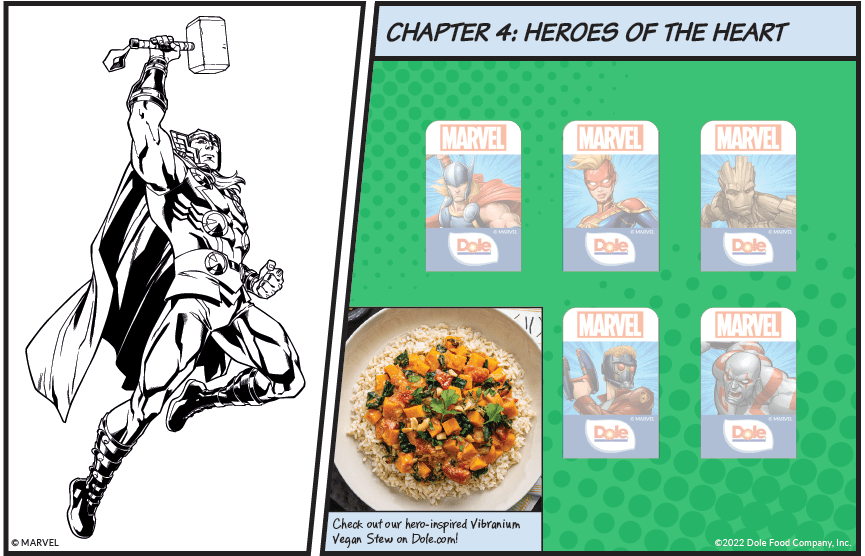 Dole Healthy Heroes, Assemble!ย is a nine-month, empowered-living initiative sponsored by fresh produce leader Dole and inspired by the Marvel Cinematic Universe. The program targets everyday heroes in four categories โ mind, soul, heart, and home โ during six-week recruitment campaigns featuring new, Marvel character-inspired recipes, original DOLE Banana stickers, and DOLE Pineapple tags, digital downloads, in-store activations, and motivational prizes awarded to inspiring heroes at the end of each period. ย