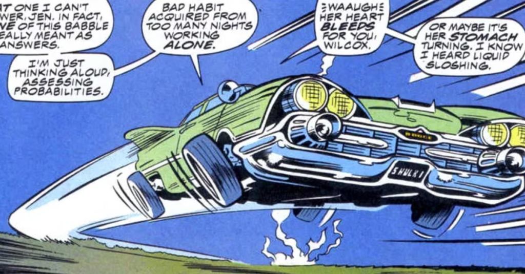 When Jen is attempting to get Nikki Ramos (Ginger Gonzaga) contact Wong, she breaks the fourth wall to acknowledge that the audience is probably excited to see him — before confirming that it’s not going to be a “cameo every week” type of show… even though all of the three prior episodes have had significant cameos. As she’s doing this, Jen’s hands are not on the wheel of her still-driving car — which could be an homage to the self-driving flying car she got from U.S. Archer during the Sensational She-Hulk era.