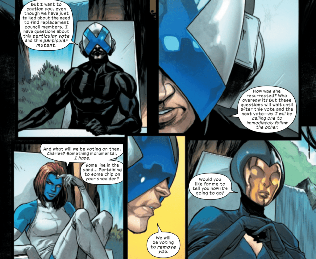 Xavier, Magneto and Moira quickly move to vote someone into the Quiet Council that they trust. However, beforehand they try to recruit Emma Frost to their side by letting her in on Moira’s secret. Unfortunately, that doesn’t go as well as they had assumed, and it’s unclear if they’ve made an enemy of the White Queen or not. Still needing someone they can trust, another vote is held by the Quiet Council. Villains like Mister Sinister, Mystique, Sebastian Shaw and Destiny vote “No,” while Xavier, Magneto, Exodus, Storm, Kate Pryde, Nightcrawler, Emma Frost vote “Yes.” It’s here that the final new member of the Quiet Council is revealed to be longtime X-Man, Colossus.