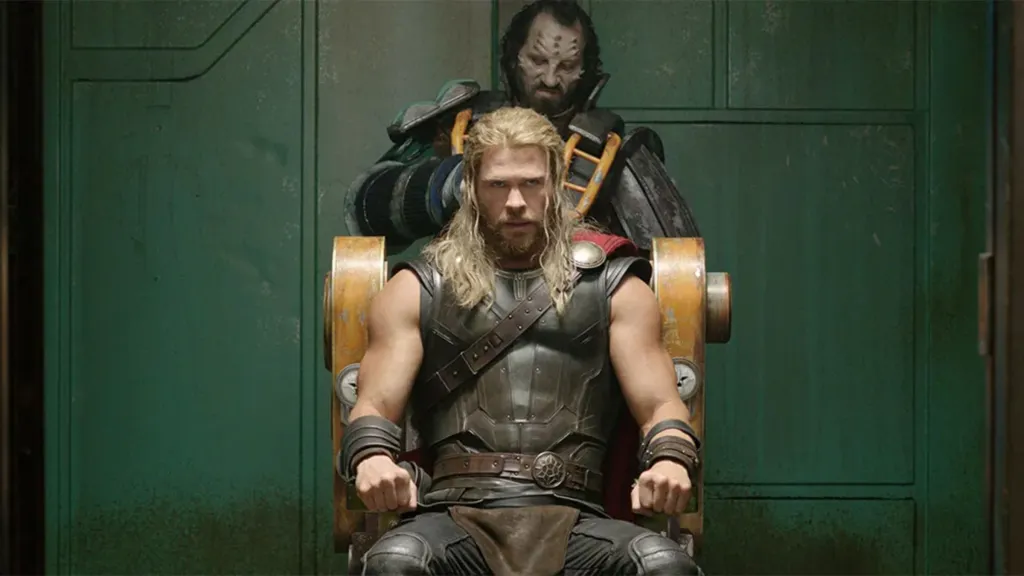 In Thor: Ragnarok, we open on the title character chained up by the fire demon Surtur. He’s in a Hellish locale which seems intimidating, but it’s balanced out by a gag of Thor’s dangling chain spinning him round and round, intermittently taking his eyes off of Surtur, which deflates the impact of the massive demon’s grave speech. It’s a balance that works. Neither half of the comedy movie-superhero movie coin outweighs the other. For that matter, neither half of the coin feels too heavy in general.