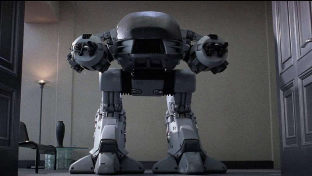 The weaponry works because it matches the satire. Those cannons represent power sold as security, then used with zero restraint. Even the hardware design helps, with the mech’s bulk and mechanical targeting giving it the vibe of a walking procurement mistake. Many sci-fi guns aim for cool, but ED-209’s guns now feel terrifyingly plausible.