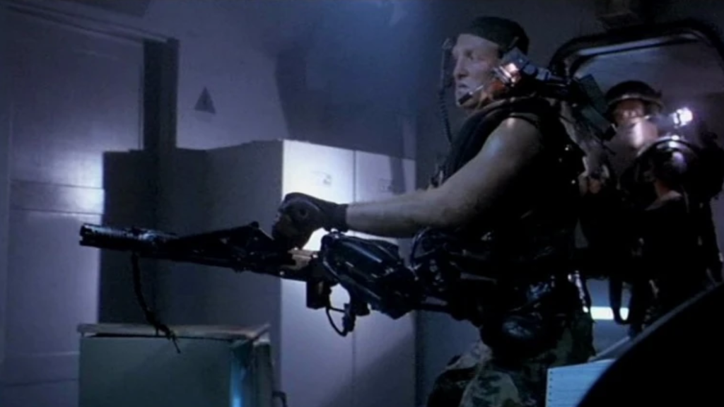 The M56 Smartgun from Aliens (1986) looks likea crew-served weapon turned into a wearable nightmare. It rides on a Steadicam-style harness and tracks targets with a futuristic interface, letting the operator move while carrying absurd firepower. The film sells it with swagger and competence, especially in the hands of Vasquez and Drake. It screams “overkill,” which is exactly what you want before the aliens prove it still won’t be enough.