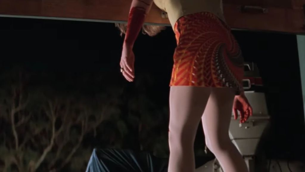 But she doesn’t. Instead, Ghostface raises the garage door, resulting in her head getting squished up against the mechanism and ceiling. We get a swift shot of her head flattening and, later, Sidney looks in horror as her best friend hangs lifeless, her body weight still not having caused the door to fall back down. This is also a great kill because Stu’s party continues to go on even as she’s out there dead. We cut back into the house but we’re still thinking about poor Tatum.