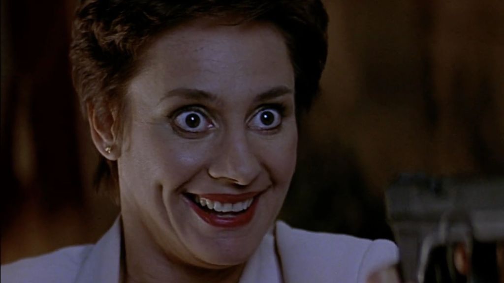 Scream 2 notoriously had its script leak, and in that script both Derek and Hallie were the killers. Suffice to say, the final product’s killers are much better. Mrs. Loomis’ presence is far more believable. After all, we already learned in the original film that her ex-husband’s cheating on her rattled her cage, so why not have her come back when she learns her child was shot in the head? Granted, the scenes with her annoying Gale throughout the movie (under the name Debbie Salt) are a bit of a tell that she’s not who she’s claiming to be, because why else would she get so much screentime, but it still works, primarily because Debbie is so off the audience sees her as a red herring character. It just so happens this herring ends up being the real thing.