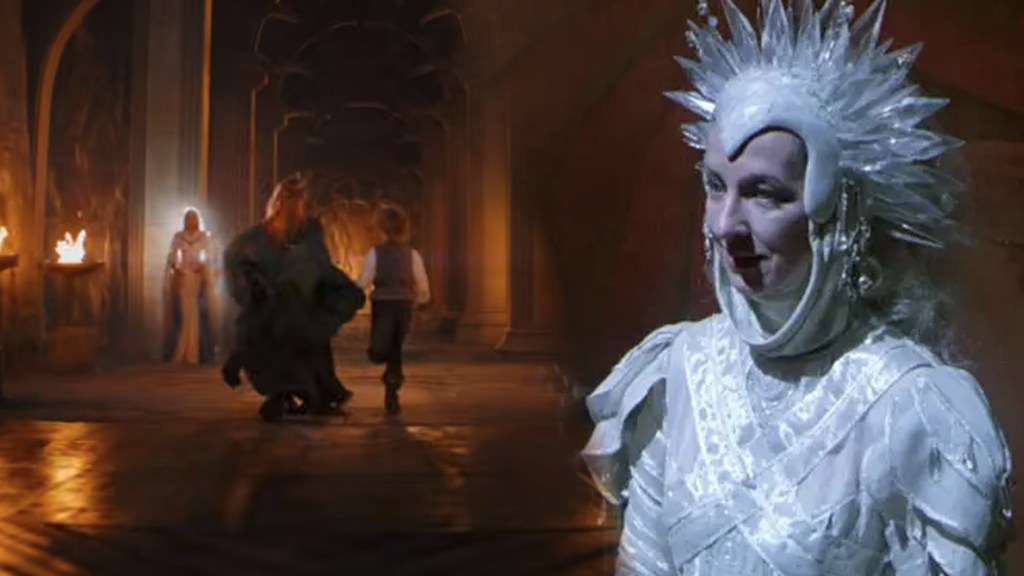 In the original 1987 film, the role of The Sorceress was played by Christina Pickles, and the costume was far more ornate and almost all white and silver. The headdress also changed things up and was covered in crystals, which was a big departure from the original costume that was white, blue, and orange and featured a wing-like cape.