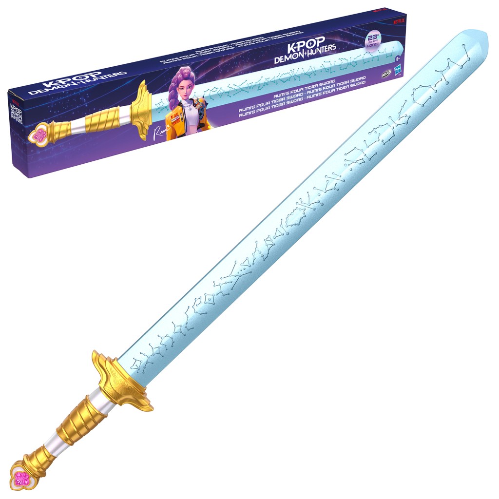(HASBRO | Ages 6 years & up | Retail Price: $14.99 | Available at most major retailers starting 7/15/26) – The NERF KPop Demon Hunters Rumi’s Four Tiger Sword is inspired by the Netflix animated movie! It captures the look of the Sword used by Rumi, lead HUNTR/X singer and demon hunter in the musical fantasy about a K-Pop girl group that secretly doubles as a trio of demon hunters. Rumi is lead singer of the HUNTR/X group and wields the Four Tiger Sword to battle demons. The 24-inch sword has a foam blade with pearlescent treatment,โฏplastic core, and plastic hilt. It’s a perfect accessory for role play, cosplay, and epic demon-hunting adventures. Expand the imaginative game play and build your KPop Demon Hunters collection with Zoey’s Spirit Blades and Mira’s Curved Moon Sword (each sold separately, subject to availability).