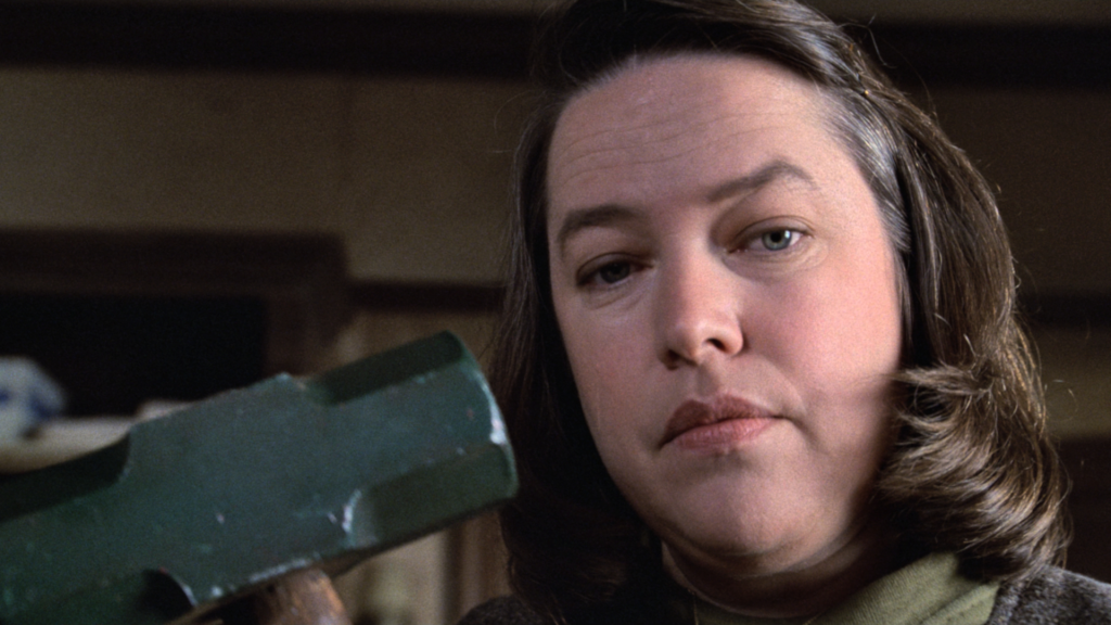 Novelist Paul Sheldon (James Caan) has grown tired of the Victorian romance novels that made him famous, and kills off his character in hopes of relaunching his career as a “serious” writer. While traveling to NYC for an event, Paul is caught in a blizzard and ends up crashing his car. When he wakes up, he finds he is in the “care” of self-proclaimed nurse and superfan Annie Wilkes (Kathy Bates). However, it quickly becomes clear that Annie is unstable and intends to keep Paul hostage until he writes a new, happier ending to his Misery book series.