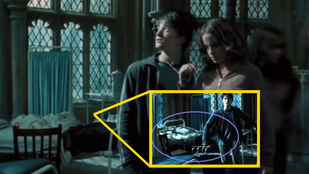Hospital Wing scenes are always a little spooky, and Madam Pomfrey’s bedside manner leaves much to be desired. But in this case, it’s the linens that are working overtime. In one shot, we can clearly see the neatly folded blankets on Harry’s bed. Then, when Hermione says, “Sorry Ron, but seeing as you can’t walk,” the bed Harry was lying in moments earlier is suddenly in disarray. The blankets are crumpled up, the chair is shifted, and the blue screens have been moved around.