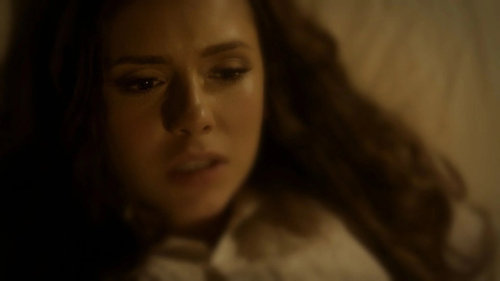 In “500 Years of Solitude” Katherine Petrova (Nina Dobrev) is dying of heart failure, due to rapid aging caused by “The Cure” being removed from her body. The episode is supposed to serve as a eulogy for Katherine, with many people from her past either showing up at her deathbed, or appearing in flashbacks or hallucination sequences, as the former immortal’s life literally flashes across her mind. In the end, Katherine’s daughter Nadia (Olga Fonda) helps her cast a “Passenger” spell that allows her to possess a different body. The big cliffhanger twist is revealed when Katherine ends up hijacking the body of Elena Gilbert (also played by Dobrev), the Petrova Doppleganger who is every bit the good soul that Katherine is not.