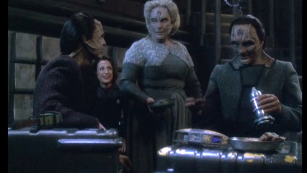 The third and final Season 3 episode Brooks would direct, “Improbable Cause,” features Garak, who survives a bombing in his shop, and launches an investigation into who targeted him. The storyline expands when Odo uncovers a conspiracy involving the Romulan Tal Shiar and Cardassian Obsidian Order. The episode ends on a cliffhanger that leads directly into “The Die Is Cast.” Odo’s interrogation of a Flaxian assassin, Garak’s evasive antics, and the discovery of a joint Cardassian–Romulan fleet preparing for an unauthorized strike. Brooks does a good job directing this dialogue-driven episode, and handles the unravelling of Garak’s past with care.