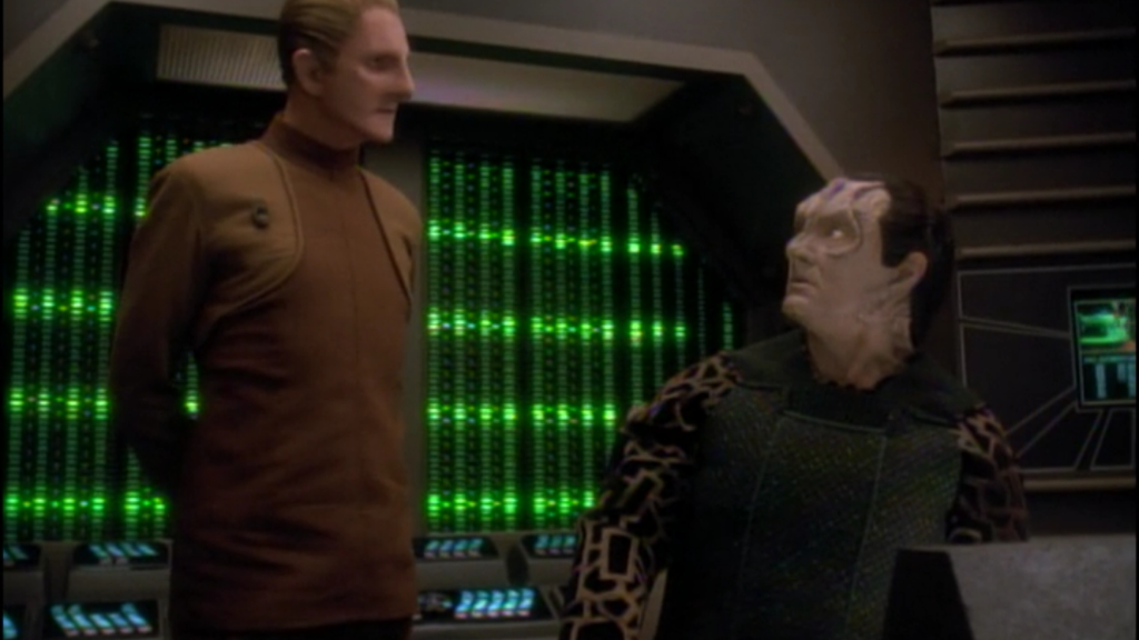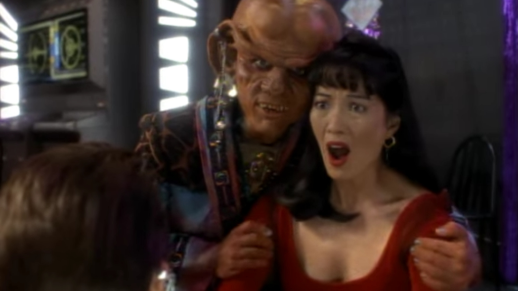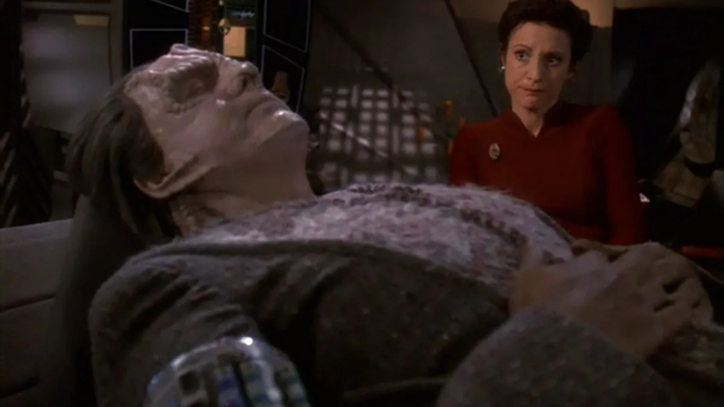 A late Season 4 episode, “Body Parts,” centers on Quark believing he is dying and selling his remains in an auction, only to discover he is actually perfectly healthy. When the buyer (Brunt of the FCA) demands fulfillment of the contract, Quark faces a moral and physical dilemma about whether to follow Ferengi law. Meanwhile, the subplot follows Kira recovering from an injury and carrying the O’Brien’s baby after Keiko’s accident. Brooks does a good job balancing the tones between Quark’s panic and the intimate moments of the Kira/O’Brien storyline, a task that is hard for even lifelong directors.