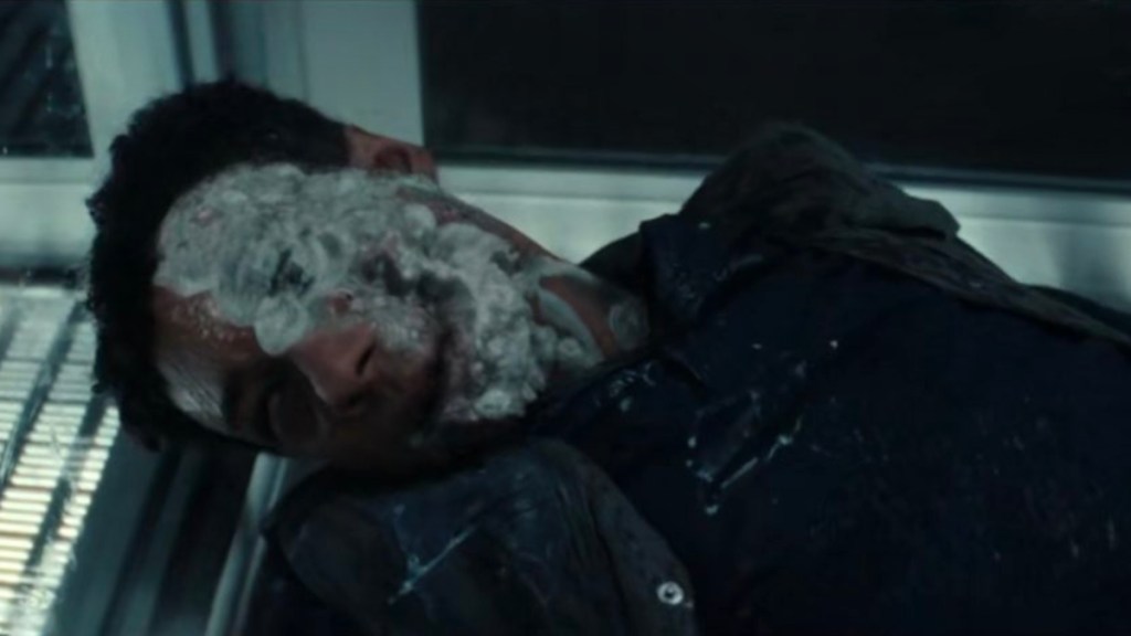 The first clue we get that this creature is different is when “Lost Boys” hybrid squad member Smee (Jonathan Ajaji) is taking on the job of feeding the specimens. Smee stacks a tray with metallic objects like junk tech and metallic ore to feed to the Flies, which is a massive red flag reveal: these creatures eat metal. Smee’s fate is sealed by the Eye creature, which uses the sheep’s body it’s infesting to ram the wall and trigger the door to the Fly’s holding cell, locking Smee inside. One of the Flies comes down from the hive and promptly spits a gel onto Smee’s face, which melts his android body down into liquid, which the Flies then suck up through a hose-like proboscis.