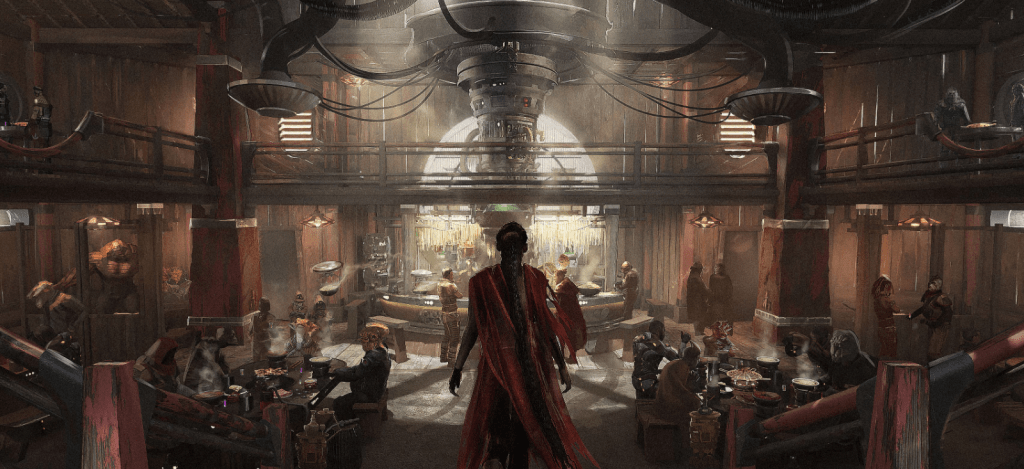 Abrams has given ComicBook this exclusive glimpse of The Art of Star Wars: The Acolyte, showing concept art of some key moments in the first episode. The first is a beautiful glimpse of the planet Ueda, which featured a location designed as a homage to the famous Mos Eisley cantina. The version of Mae seen in this concept art is very different to the final character, clad in robes that are a deep Sith red and demonstrate her allegiance.