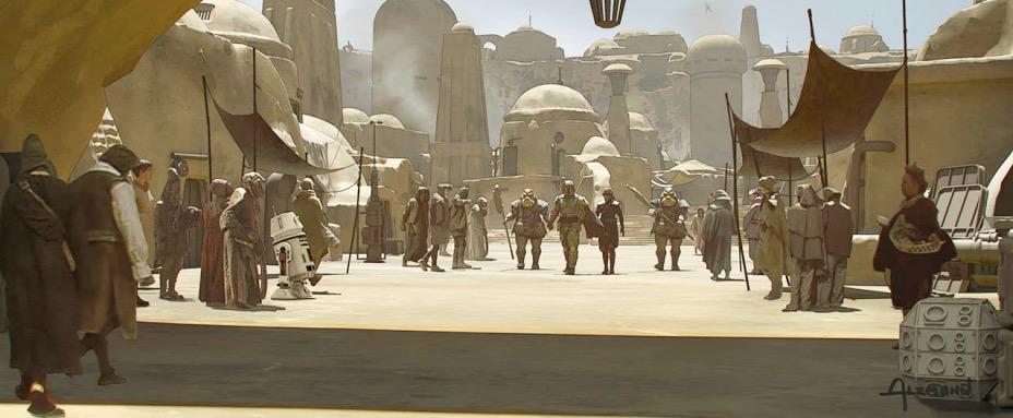 Lucasfilm has released the official concept art from “Chapter 3: The Streets of Mos Espa,” featuring art by Christian Alzmann, Ryan Church, and Erik Tiemens. Below, see the conceptual versions of Fett’s meeting with the Hutts outside Jabba’s Palace, Fett’s new pet beast under the training of a Rancor keeper (Danny Trejo), and the biker gang chase for the Mayor’s Majordomo (David Pasquesi).