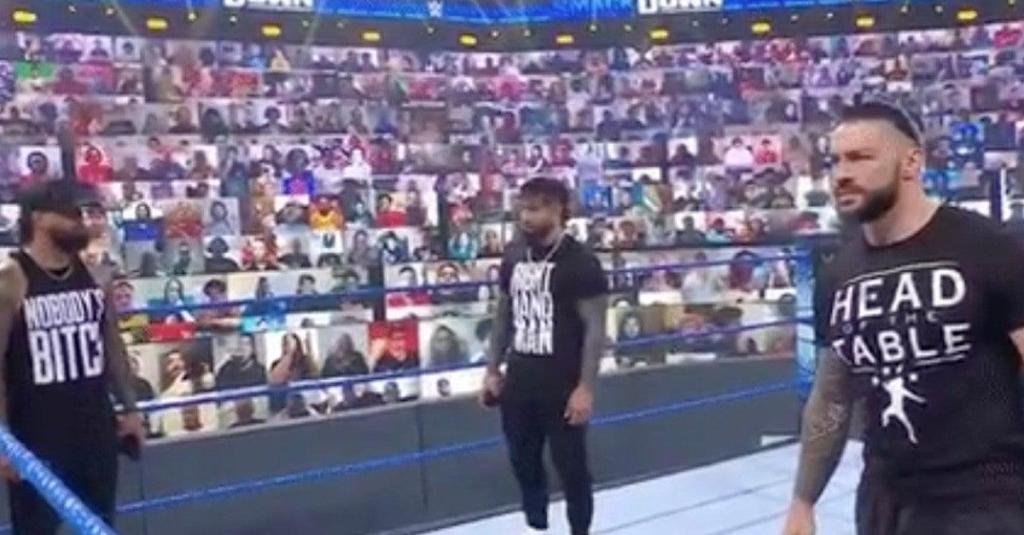 Jey Uso kicked off tonight’s SmackDown as he called out his brother Jimmy after what happened last week. It didn’t take long for Roman Reigns and Paul Heyman to join him, and then Jimmy came out so the party could get started. Jimmy was not apologetic in the least, and in fact had a shirt that said “nobody’s b****” to show what he thought of Jey and Roman’s dynamic. He then said he wasn’t even sure if Reigns could beat Cesaro, and Reigns had to address it.